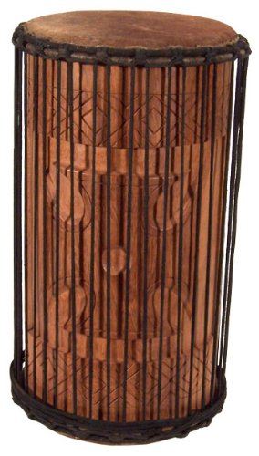 These drums are masterfully carved in a traditional West African pattern. The drums are constructed of a single piece of legally harvested Masonia wood. The heads are made of cow hide for durability as they are played with sticks. The hair is left on the heads to eliminate any ringing sounds and to provide a nice heavy bottom end.